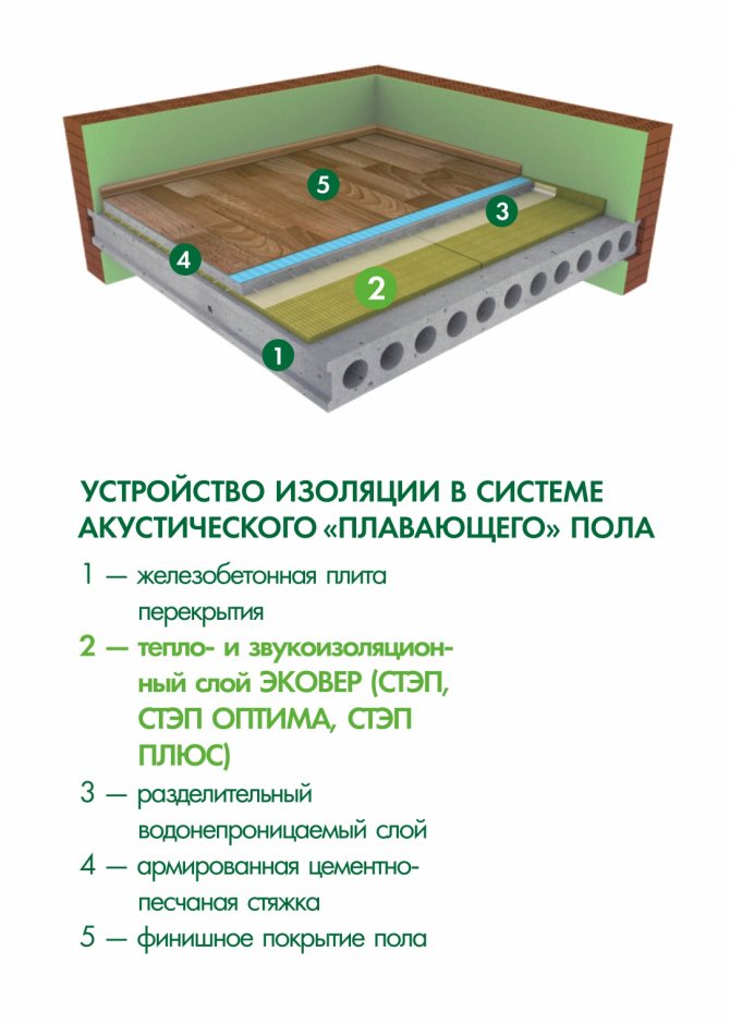 La structure est constituée de panneaux de type "Module" ou "Vector", triplex insonorisant et feuille de contreplaqué de 18 mm d'épaisseur. Cet étage offre une isolation phonique jusqu'à 38 décibels. Hauteur du sous-plancher - jusqu'à 110 mm.