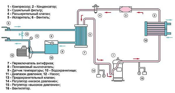 Le circuit du refroidisseur et son appareil sont basés sur ce principe. De nombreuses unités fonctionnent selon un cycle de réfrigération inversé - au lieu de refroidir, elles génèrent de la chaleur. Il est préférable de montrer le fonctionnement du refroidisseur sur un diagramme schématique ou sous la forme d'un dessin de l'équipement de refroidissement.