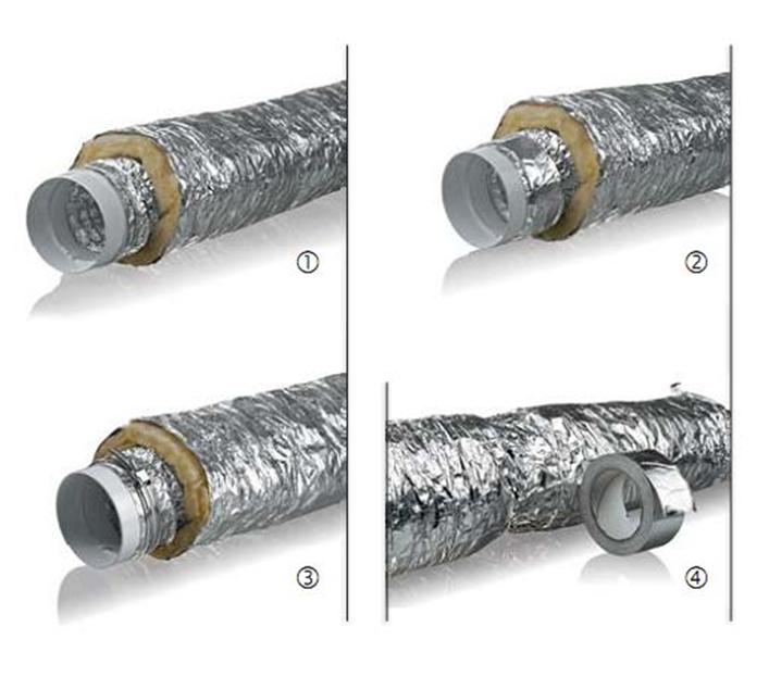 Les coudes flexibles en forme de canaux ondulés sont connectés avec du ruban "aluminium", des connecteurs à vis ou des pinces ordinaires.