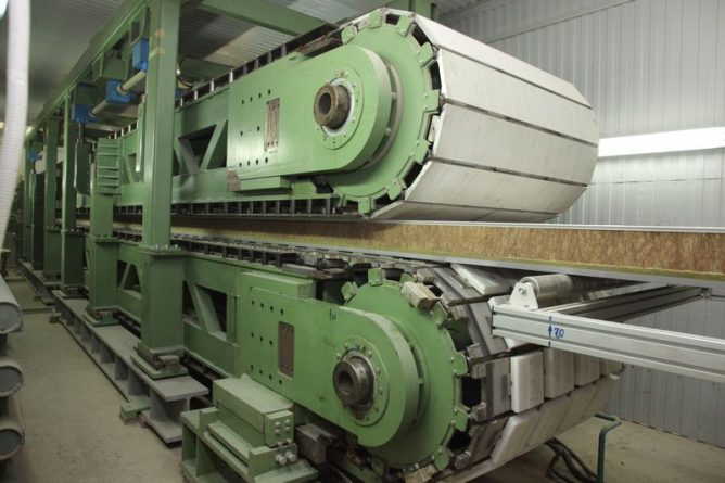 Ensuite, le coton formé est alimenté sous les presses, où les toiles sont formées, roulées en rouleaux (faible densité) et en plaques (laine minérale de moyenne et haute densité).