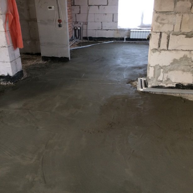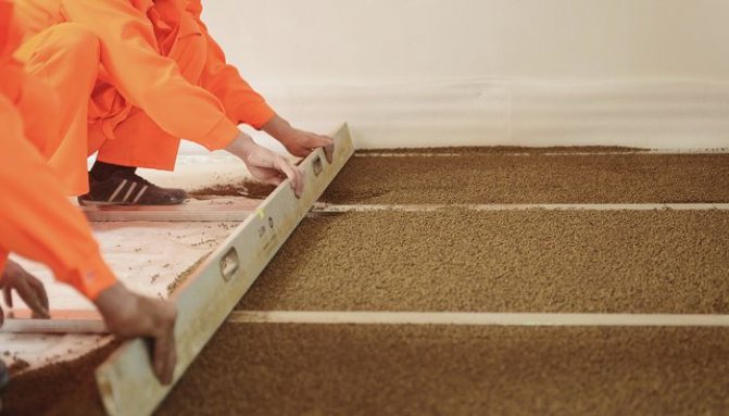 Après avoir effectué l'isolation au sol, une chape ciment-sable renforcée est coulée de leurs propres mains, sur laquelle est posé un revêtement de sol propre.