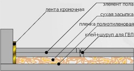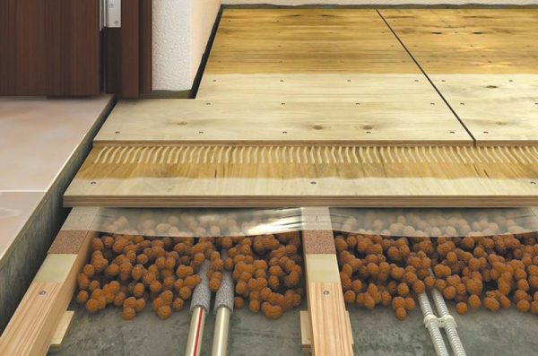 La base est recouverte d'un film protecteur sur lequel de l'argile expansée est coulée. Après avoir nivelé le coussin en argile expansée, il est recouvert de feuilles de contreplaqué ou de fibre de gypse. Feuilles de fixation - avec de la colle ou des vis autotaraudeuses.