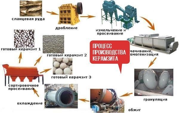 Pour la production d'argile expansée, de montmorillonite, de roches hydromiques avec une teneur en quartz d'au plus 30% sont utilisées, ou d'argile spéciale à bas point de fusion, qui est cuite dans un four rotatif. Le four est installé avec une légère pente, et en ajustant la vitesse de sa rotation, la température de cuisson du matériau et son chargement, on obtient de l'argile expansée prête à l'emploi en sortie.