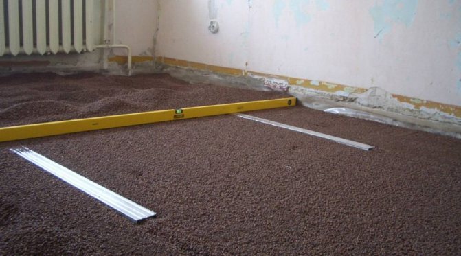 - Après le remblayage, la couche d'argile expansée est nivelée le long des bords supérieurs de la bûche. Les décalages agissent non seulement comme un support, mais aussi comme un indicateur du niveau du remblai isolant.