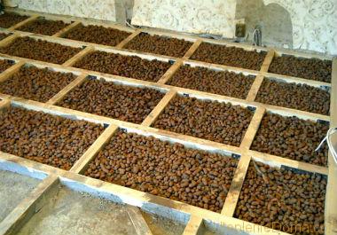 La taille et la densité des granulés dépendent de la vitesse de rotation du four: l'argile broyée commence à rouler en grumeaux, compressée et frittée. C'est ainsi que l'on obtient des granulés ovales ronds (pierre concassée, gravier) ou du sable d'argile expansé.