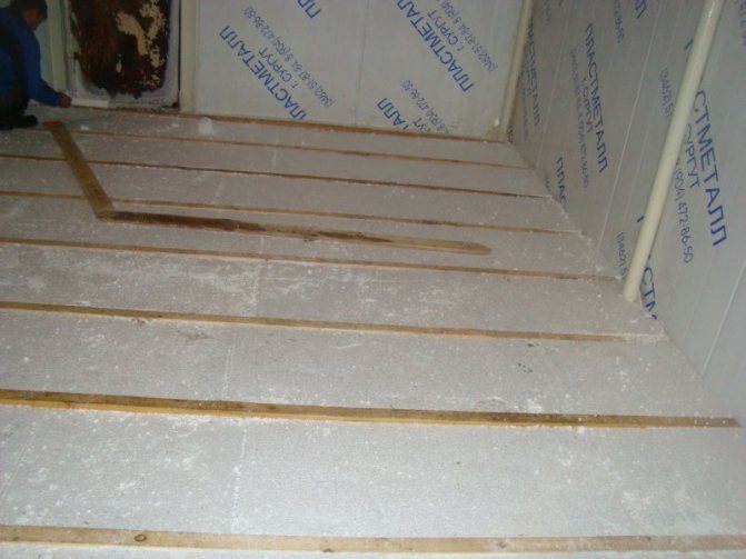 Si la maison est en bois avec un sous-sol et qu'il est nécessaire d'isoler le sol au rez-de-chaussée, un double étage est créé. Tout d'abord, les poutres sont installées strictement horizontalement, à la même distance les unes des autres.Des barres de 50x50 cm sont clouées le long du bas des poutres, des planches de 25 à 50 mm (épaisseur) sont prises et le sous-plancher est équipé. Ces planches ne sont pas fixées sur des barres préalablement clouées. Ensuite, une couche pare-vapeur est installée et l'isolant est posé.