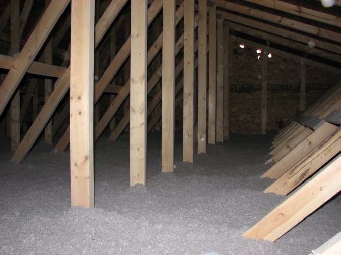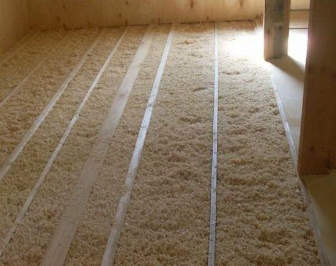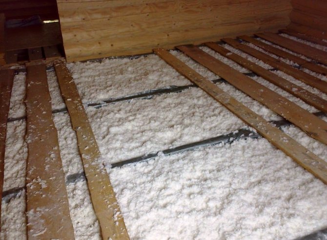 La nature et les premières étapes de ces travaux sont les mêmes que dans le cas de la sciure de bois. Après préparation de la surface, du coton est posé, les fissures et les trous sont soufflés (les gros doivent être calfeutrés), puis, tout cela est recouvert d'un film. Vous pouvez poser des planches dessus ou faire une chape.