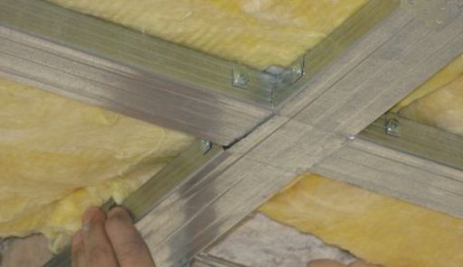 Afin de réaliser une telle double isolation du plafond par l'intérieur, la structure est assemblée, comme pour les cloisons sèches. La laine minérale est placée entre les profilés. Penofol est fixé sur le cadre, au moyen de vis autotaraudeuses, il est fixé au profilé porteur.