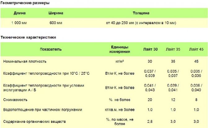 La densité nominale de la marque Light 30 correspond à un indicateur de 30 kilogrammes par mètre cube. Si vous avez besoin d'une densité plus élevée, vous devriez acheter "Light 35" ou "Light 45". Le coefficient de conductivité thermique à 10 degrés pour "Light 30" correspond à 0,037 W / m · K. La compressibilité en pourcentage de "Light 30" est de 20% et "Light 35" de 12%. L'indicateur le plus bas est dans "Light 45", il est égal à 8 pour cent.