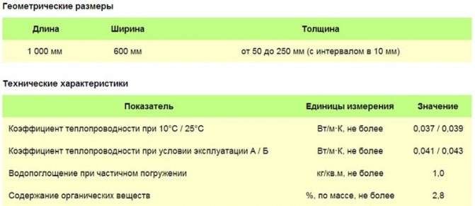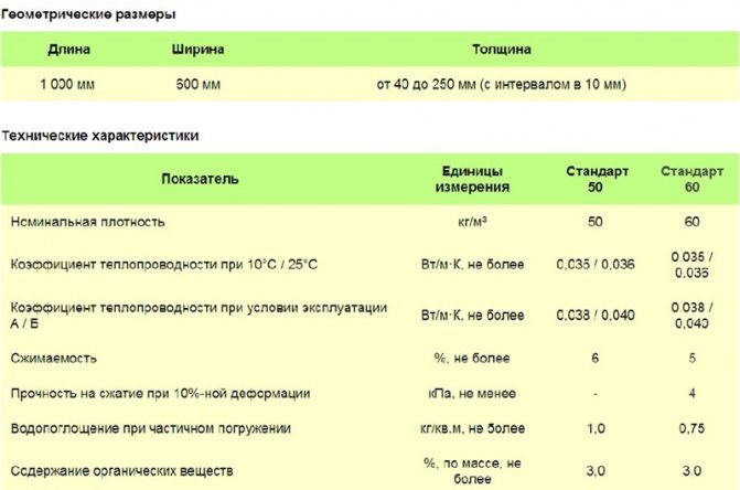 - standard 50 - a deux types de densité 50 kg et 60 kg par mètre cube. Le pourcentage de compression ne dépasse pas 6%. Diffère par des indicateurs de force accrus. Les assiettes sont emballées en 12 pièces. Volume - 0,36 mètre cube